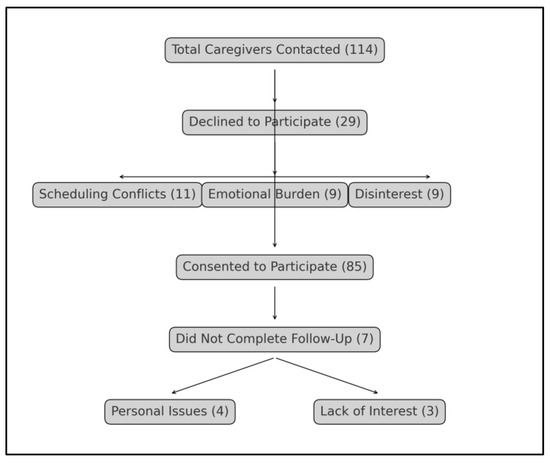 A total of 114 potential caregiver participants were initially contacted. Of these, 29 declined to participate, with reasons cited including scheduling conflicts (11 caregivers), concerns about the emotional burden of study questions (9 caregivers), and disinterest in research participation (9 caregivers). This left 85 caregivers who consented to participate. However, during the course of the study, 7 participants did not complete the necessary follow-up measurements due to unforeseen personal issues (4 caregivers) and lack of further interest (3 caregivers). Ultimately, the study concluded with 78 caregivers who completed all required baseline and follow-up measurements (Figure 1).