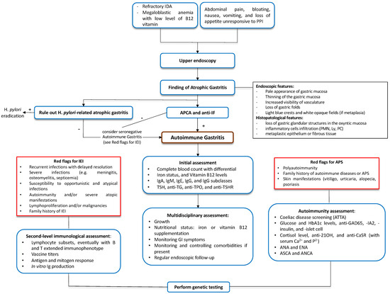A correct serological and endoscopic investigation is needed to differentiate between H. pylori-related and autoimmune atrophic gastritis. A comprehensive laboratory assessment is required to evaluate potential AIG-associated conditions and specific warning signs for IEI and APS [2,12,13,14,16,17,18,19,20,21,22,23,24,25,26,27,28]. Finally, a multidisciplinary approach is advised to ensure the optimal management of these patients.