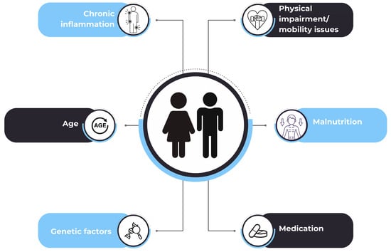Sarcopenia (Greek ‘sarx’ or flesh + ‘penia’ or loss) was first proposed by Irwin Rosenberg in 1989 as a term describing age-related muscle loss [,]. In 2010, the European Working Group on Sarcopenia in Older People (EWGSOP) defined sarcopenia as a musculoskeletal disorder characterized by muscle mass loss and reduced muscle function, mostly affecting older adults []. In 2019, the EWGSOP criteria were updated, widening the age range of patients affected by sarcopenia []. The revised definition emphasized reduced muscle strength as a primary focus for identifying sarcopenia, with a diagnosis being confirmed when low muscle mass or impaired physical performance are present []. Sarcopenia is broadly classified into two types: primary, which is age-related, and secondary, which is disease-related [].