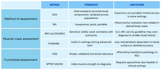 The diagnostic criteria employed for assessing sarcopenia are summarized in Table 1. Figure 2 offers insights and highlights future directions for assessing sarcopenia in RDs.