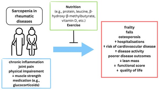 Rheumatic diseases (RDs) are characterized by increased inflammation that mostly affects joints, bones, and cartilage, leading to pain, dysmotility, physical dysfunction, and compromised well-being []. Chronic inflammation and impaired physical capability are also associated with the development of sarcopenia []. When patients with RDs present myopenia [,] and cachexia [], they are at greater risk of developing sarcopenia (Figure 1), which, in turn, may increase adverse events and lead to poorer disease outcomes. Genetic predisposition plays an important role in modulating immune-inflammatory pathways that connect joint inflammation with the muscle deterioration observed in sarcopenia []. These inflammatory processes can trigger epigenetic changes and disrupt gene expression, ultimately contributing to muscle wasting, degradation, and frailty []. Pro-inflammatory cytokines, such as interleukin-6 (IL-6) and tumor-necrosis factor-α (TNF-α), disrupt muscle homeostasis, leading to muscle deterioration []. Drug-induced sarcopenia represents a form of secondary sarcopenia [], as several therapeutic agents —including glucocorticoids (GCs), commonly used in the treatment of RDs []— have been shown to adversely affect muscle metabolism and contribute to muscle wasting through various catabolic pathways [,].