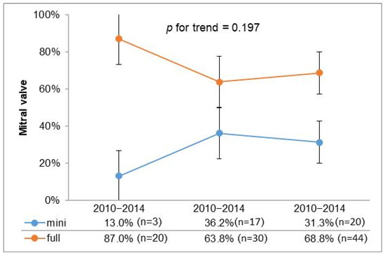 However, in cases of mitral valve disease due to endocarditis, this approach is not as widely accepted, despite reports in the literature supporting its feasibility [19]. Our retrospective study, spanning 15 years, documents the experience of a single center and highlights the evolution of MIMVS utilization, especially from the second five-year period onwards, as shown in Figure 1. A stable trend in the adoption of minimally invasive approaches in recent years suggests a consistent preference for minimally invasive techniques across different types of valvular disease, reflecting advancements in surgical expertise, improved patient selection, and potentially better perioperative outcomes associated with a minimally invasive approach.