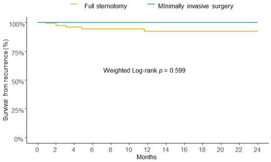 Patients were stratified according to the surgical approach: median sternotomy (n = 94) or minimally invasive techniques (n = 40).