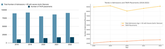 While the number of patients hospitalized with severe aortic stenosis has remained relatively stable during the period from 2018 to 2022, the proportion of patients admitted with severe aortic stenosis undergoing TAVR had a general increasing trend. While in 2018, approximately 12.1% of all patients admitted for aortic stenosis underwent TAVR, this proportion increased to 19.6% of all patients admitted with aortic stenosis by 2022. The total number of TAVRs also had a general increasing trend, with 17,784 TAVRs performed in 2022 compared to 10,788 in 2018. This was a 64.87% increase in 5 years. More liberal recommendations exist for TAVR compared to its introduction in 2012, which is reflected in the increasing trend in TAVR placements. The introduction of TAVR in 2011 was initially associated with higher rates of procedural complications and treatment failure. Adverse outcomes were mainly attributed to the limitations of the first-generation device technology, which required 18F to 24F catheter arterial sheaths, frequent use of transapical and direct aortic access, near-universal use of general anesthesia, and limited operator experience. Over the past decade, however, there has been a transformation in TAVR technology and periprocedural care and rapid evolution of procedural techniques, leading to marked improvements in procedural success and safety. In addition, with the completion of multiple randomized clinical trials, the use of TAVR has expanded to include intermediate-risk and low-risk patients. As a result of these concurrent trends, there have been marked reductions in the rate of most TAVR complications, as well as in procedure-related mortality. Between 2012 and 2018, 30-day mortality decreased from 7% to 2%, the incidence of 30-day composite adverse events decreased from 26% to 11%, and 1-year mortality decreased from 24% to 12% [14]. This finding mirrors trends seen in numerous other national registry studies that similarly find that the volume of TAVR procedures has steadily increased in recent years [15,16,17,18,19], in some cases with a concomitant decrease in the number of patients undergoing surgical valve replacement. Analyzing the total number of admissions for severe AS (Table 1), a drop in total admissions were seen in the 2020–2021 range. This could be attributed to the COVID pandemic. However, this did not affect the total number of TAVR placements during this time period.