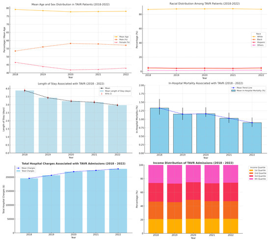 An increasing trend in the total number of TAVR procedures was seen between 2018 and 2022, with 17,784 procedures in 2022 compared to 10,788 procedures in 2018. The mean age of the admissions undergoing TAVR remained between 77 and 80, and no significant variance across the years was observed in the one-way ANOVA. No significant disparities in terms of median household income were observed in the trends for TAVR procedures over the years. A general declining trend in the mean length of hospital stay, as well as in all-cause mortality during the hospital stay, was observed; however, no variance was observed in the one-way ANOVA across the years. Total hospital charges associated with the admissions for TAVR were observed to have an increasing trend, but no variance was observed across the years. These results are summarized in Figure 1.