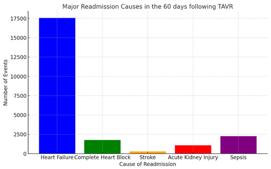 We identified 123,376 index admissions for TAVR procedures between the months of January 2021 and October 2022 using the National Readmissions Databases for the years. The index admission events were followed over a period of 60 days to analyze readmission events. From this patient population pool, 28,654 patients had readmission events in the 60-day follow-up period, and a total of 66,100 readmission events were recorded in these 28,654 patients in the 60 days following TAVR.