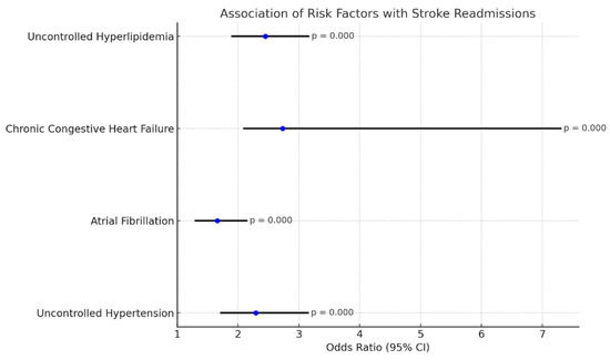 Comorbid factors documented in the index admission population that held significant association with stroke in the 60 days post-TAVR are as follows. These are depicted in a forest plot in Figure 3.