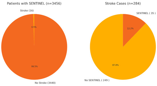In patients with readmissions for stroke in the 60 days following TAVR, we analyzed the presence of the SENTINEL embolization protection system used during the TAVR procedure. Of the 284 stroke readmissions, 87.8% of patients who had stroke readmissions in the 60 days following TAVR did not have a sentinel embolic protection device during the procedure. A total of 3456 index admissions for TAVR had a documented SENTINEL embolization protection system in place during the procedure. A total of 16 readmission events for stroke were recorded in the 60 days following TAVR among index admissions with documented SENTINEL embolization protective systems used during TAVR. The results are summarized in Figure 4.