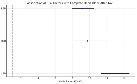 Analyzing the prevalence of various pre-existing conduction system defects in patients undergoing TAVR who were found to have a complete heart (CHB) in the sixty days following TAVR, left bundle branch block (LBBB), right bundle branch block (RBB), and bifascicular block (BFB) were found to have significant association (Figure 5). A review in the Journal of the American College of Cardiology (JACC) states that there is conflicting evidence to suggest whether LBBB is a predictor of permanent pacemaker (PPM) implantation for complete heart block following TAVR [25]. An analysis of the PARTNER trial in the JACC interventional journal did not list LBBB as a predictor of PPM implantation [26]. The same trial did, however, list RBBB as a risk factor for needing a PPM within 30 days post-TAVR. The Emory risk score used to predict the need for PPM after TAVR does not list LBBB or BFB as risk factors [27]; however, our data showed that both were associated with OR around 9. One of the rationales for not including LBBB in risk stratification protocols for PPM implantation is that about 50% of those with new-onset, post-TAVR LBBB will have normalization of their EKG findings [28]. Our data may provide reasons to reconsider this stance.