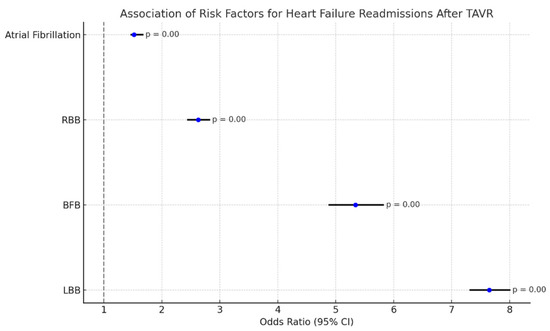 Heart failure (HF) remained the major cause of readmission in the sixty days following TAVR. Documented LBB, BFB, RBB, and atrial fibrillation in the index admissions for TAVR were factors that held significant association with heart failure readmission (Figure 6). Previous studies have shown readmissions rates in the one year following TAVR ranging from 25.4% to 52.2% and approximately half of these readmissions being of cardiovascular causes. HF readmissions can significantly impact the long-term outcomes of TAVR based on these study results [29]. In a retrospective analysis of one-year outcomes following TAVR, previous myocardial infarction, diabetes, atrial fibrillation, CKD, and pulmonary hypertension were found to be significant risk factors predictive of heart failure readmissions. It was also noted in this study that the use of angiotensin-converting enzyme inhibitor/aldosterone receptor therapy at >50% of the optimal dose had a significant impact in preventing HF readmissions.