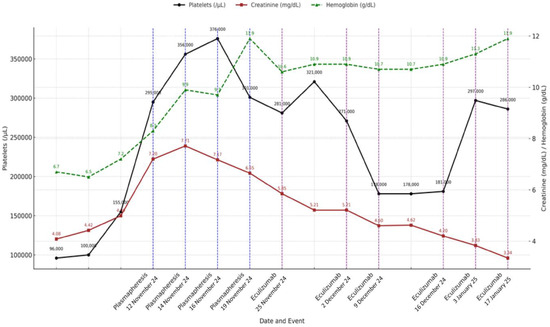 Evolution of platelet count, hemoglobin level, and serum creatinine over time showing key clinical interventions, including therapeutic plasma exchange (blue dashed lines) and eculizumab administration (purple dashed lines). Analytical values are annotated on each data point. Platelet count is represented on left Y-axis, while hemoglobin and creatinine levels are plotted against right Y-axis. Dates on X-axis correspond to timing of therapeutic events.