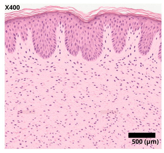 Histopathological section of skin affected by vitiligo (hematoxylin and eosin staining, original magnification ×400). The epidermis exhibits preserved stratification and architecture, but there is a notable absence or significant reduction of melanocytes in the basal layer. The superficial dermis shows a mild perivascular inflammatory infiltrate without evidence of collagen or vascular damage. These histopathological findings confirm the diagnosis of vitiligo, characterized by selective melanocyte loss and minimal inflammatory response.