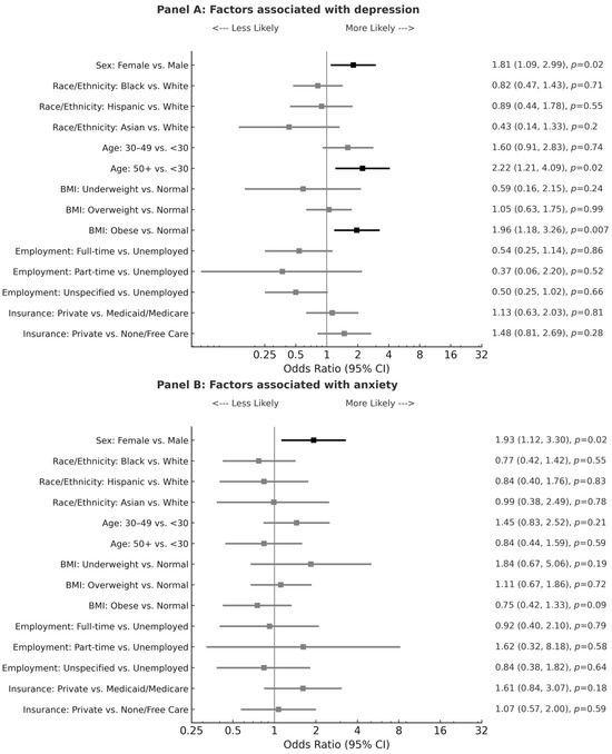 Forest plots for factors associated with depression and anxiety by multiple logistic regression analysis. Forest plots presenting odds ratios (ORs) and 95% confidence intervals (CIs) for demographic, socioeconomic, and clinical factors associated with depression (Panel A, top) and anxiety (Panel B, bottom). An OR > 1 indicates higher odds relative to the reference group. BMI is body mass index; Underweight: BMI < 18.5; Normal: BMI between 18.5 and 24.9; Overweight: BMI between 25 and 29.9; Obese: BMI ≥ 30. Unspecified employment also includes students. OR ratio bars are depicted in black for significant values.
