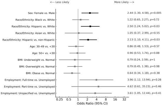 Forest plot for factors associated with IBS with constipation by multiple logistic regression analysis. A forest plot showing ORs and 95% CIs for demographic, socioeconomic, and clinical predictors of IBS with constipation compared with non-constipation IBS subtypes. An OR > 1 reflects higher odds of constipation-predominant IBS relative to the reference group. Non-Hispanic race/ethnicity includes White, Black, and Asian. BMI is body mass index; Underweight: BMI < 18.5; Normal: BMI between 18.5 and 24.9; Overweight: BMI between 25 and 29.9; Obese: BMI ≥ 30. Unspecified employment also includes students. OR ratio bars are depicted in black for significant values.
