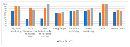 Figure 1 graphically shows the trend in QoL related to the dimensions of physical, psychological, and emotional well-being from t0 to t2. All the dimensions explored except for “role limitations due to physical health”, “pain”, and “general health” show a trend of improvement at t2.