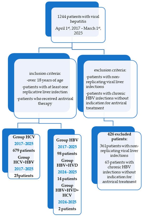 The inclusion criteria were: adults with chronic hepatitis infections with at least one replicative virus who received antiviral treatment between 1 April, 2017, and 1 March, 2025, according to the Romanian criteria for the administration of these therapies at the time of antiviral initiation.