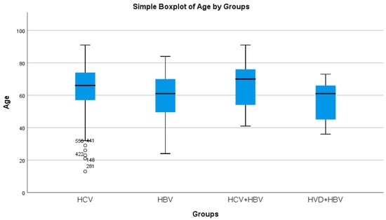 HBV/HCV co-infected patients had the greatest average age, whereas HBV/HDV co-infected patients had the lowest (statistically significant difference, p = 0.0214) (Table 2a, Figure 2). Both the HBV/HCV co-infection and HCV single-infection categories were dominated by women (Table 3). Urban background was more common across all study groups (Table 3).