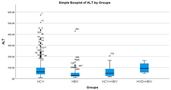 Comparative analysis of the mean ALT (mg/dL) levels in the study groups of patients with hepatic single infections and hepatic co-infections.