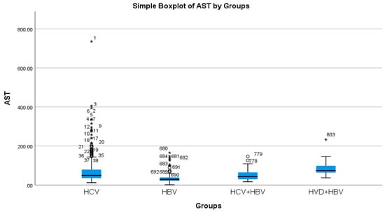 Comparative analysis of the mean AST (mg/dL) levels in the study groups of patients with hepatic single infections and hepatic co-infections.