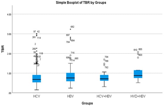 Comparative analysis of the mean TBR (mg/dl×102) levels in the study groups of patients with hepatic single infections and hepatic co-infections.