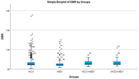 Comparative analysis of the mean DBR (mg/dL mg/dl×102) levels in the study groups of patients with hepatic single infections and hepatic co-infections.