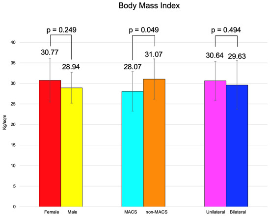 BMI was similar between females and males, between the patients with MACS vs. non-MACS, and the subjects with unilateral vs. bilateral tumors (Figure 2).