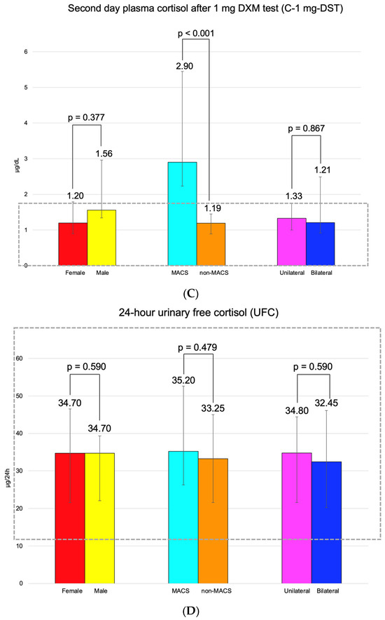 (A). Clustered bar charts showing mean morning plasma (baseline) cortisol levels in the studied subgroups (with a 95% confidence interval). (B). Clustered bar charts showing mean plasma cortisol at 6 p.m. levels in the studied subgroups (with a 95% confidence interval). (C). Clustered bar charts showing median second-day plasma cortisol after 1 mg dexamethasone suppression test levels in the studied subgroups (with 95% confidence interval). (D). Clustered bar charts showing median 24-h urinary free cortisol levels in the studied subgroups (with 95% confidence interval).