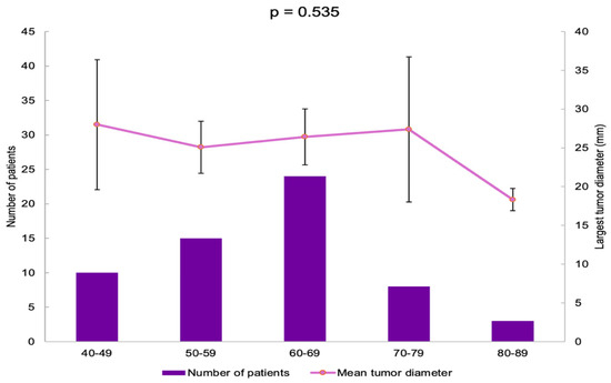 The largest tumor diameter was found to be 28.00 ± 11.72 mm in the 40–49 years group, and it was similar among all the age groups (p = 0.535) (Figure 4).