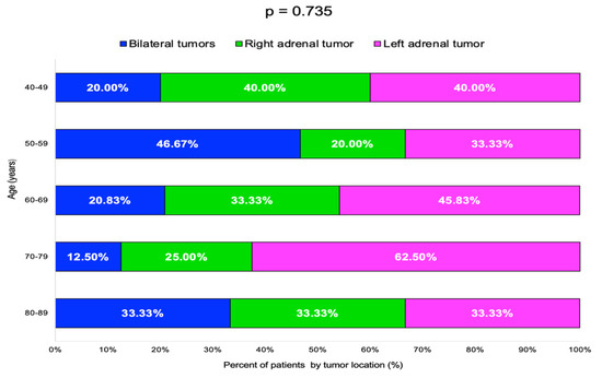 The highest rate of bilateral tumors was 46.67% in the 50–59 years decade, while for single incidentalomas, the rate of right/left-gland involvement varied without statistical significance (Table 4, Figure 5).