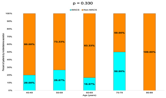 Non-MACS profile was found in 80.00% of the patients in the 40–49 years age group, 73.33% in the 50–59 years group and 83.33% in the 60–69 years group. In the 70–79 years group, the rate of MACS-positive and non-MACS tumors was equal (50.00%), while in the 80–89 years group, 100.00% of the tumors were non-MACS (Table 5, Figure 6).