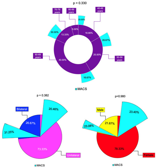 Synopsis of MACS profile among analyzed subgroups: multi-level doughnut chart showing the percentage of patients by age group (magenta) and percentage of patients with MACS-positive profile (turquoise) in each age group; the percentage of unilateral (pink) and bilateral (blue) adrenal incidentalomas, and percentage of patients with MACS-positive tumors (turquoise) in each group; the percentage of females (red) and males (yellows) and percentage of patients with MACS-positive incidentalomas (turquoise) in each group (N = 60).