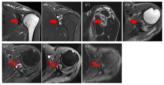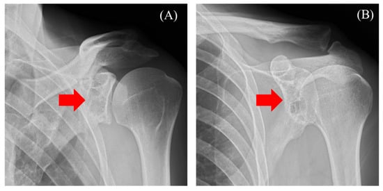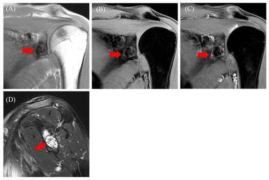 The patient was a 47-year-old man who presented with shoulder pain radiating from the left side of the neck to the shoulder, which began two months ago. He had previously consulted a nearby clinic one month prior. The primary pain site was the trapezius muscle, and no tenderness was noted in the shoulder joint. The range of motion of the shoulder joint was intact. Additionally, although the patient experienced numbness in the left palm, there was no sensory dullness, impairment in hand movement, dexterity, or muscle weakness. No history of past illnesses or trauma was recorded. Radiography showed a radiolucent area with a sclerotic margin in the left scapular glenoid, but no narrowing of the joint space or abnormalities in the humeral head were observed (Figure 1A,B, red arrow). Suspecting a benign bone tumor of the scapula, an MRI was performed.