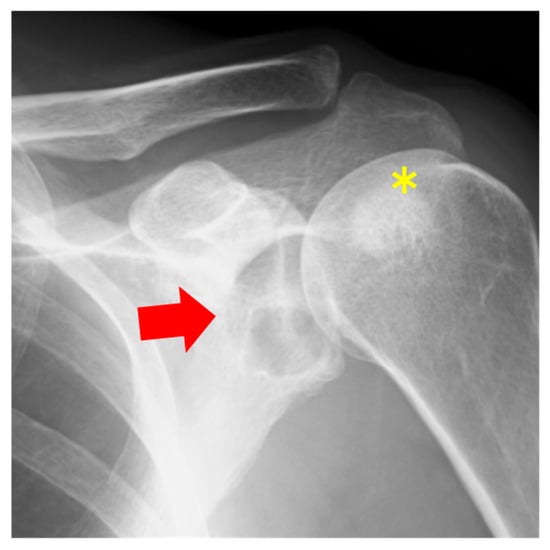 Radiography shows a radiolucent area with a sclerotic margin (red arrow) and sclerotic regions of the humeral head (yellow asterick).