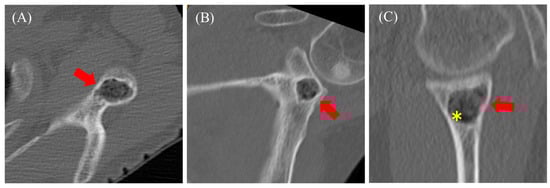 Computed tomography reveals a lobulated translucent image with a sclerotic margin and scattered air density within the lesion ((A–C) red arrow). The asterisk indicates the location where CT value was measured. Bone defects in certain areas suggest communication with the joint ((C), yellow arrow).