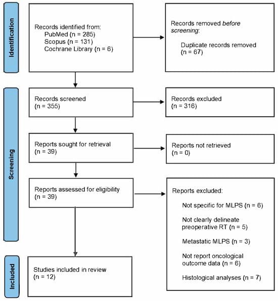 The literary search found 422 papers. After the removal of 67 duplicates, 355 manuscripts were screened by title and abstract. Then, 39 studies were evaluated in full and 26 were excluded due to not being specific to MLPS (n = 6), not clearly delineating preoperative RT (n = 5), focusing on metastatic MLPS (n = 3), not reporting oncological outcome data (n = 6), or being histological analyses (n = 7). Finally, 12 articles were included in this review: 10 retrospective and 2 prospective studies (Figure 1).