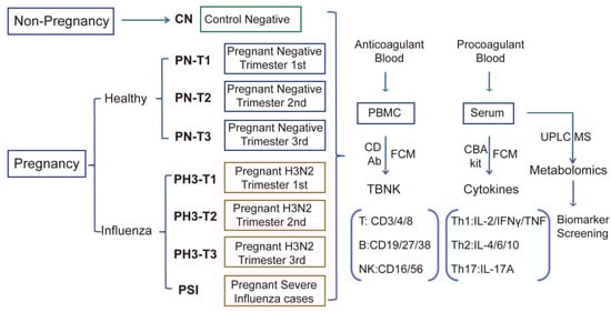 Scheme and implementation of this study. Non-pregnant healthy (CN), pregnant healthy (PN)/influenza women (PH3), and severe influenza cases of pregnant women (PSI) were included in this study, and corresponding biological samples were collected. Anticoagulants were used to detect the proportion and function of TBNK immune cells, and procoagulant serum was used to detect cytokines and serum metabolomics.
