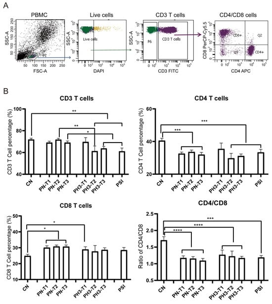 The results showed significant changes in immune cell populations, particularly in the second and third trimesters of pregnancy. For T cell alteration (Figure 2), a significant reduction in total CD3+ T cells was observed in the second (PH3-T2) and third (PH3-T3) trimesters of pregnancy influenza groups and the PSI group compared to both the control (CN) and healthy pregnancy (PN) groups. A similar decline was noted in CD4+ T cells in all PN groups, PH3-T2/T3, and PSI groups. Meanwhile CD8+ T cells were elevated in all PN groups and the first trimester of PH3 (PH3-T1) but were not observed in subsequent trimesters. The decrease in CD4+ T cells or increase in CD8+ T cells resulted in a decline in the CD4/CD8 ratio across all pregnant groups, including both healthy women and those infected with H3N2. This ratio fell below the normal value of 1.4, suggesting potential immune tolerance and compromised immune function in pregnant women, particularly those infected with H3N2.