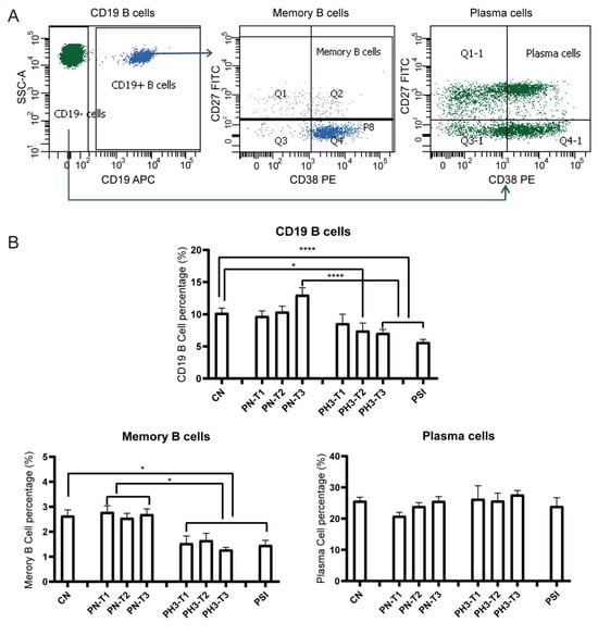 For B cells (Figure 3), a significant decrease in total CD19+ B cells was observed in the PH3-T2/PH3-T3 and PSI groups compared to both the CN and PN groups. Memory B cells (CD19+CD27+CD38+/−) in all PH3 and PSI groups declined compared to both the CN and PN groups. However, no significant differences were noted in plasma cell populations in all groups. The loss or deficiency of memory B cells, especially in the second and third trimester of pregnancy, could lead to a diminished humoral immune response and increased susceptibility to influenza virus in pregnant women.