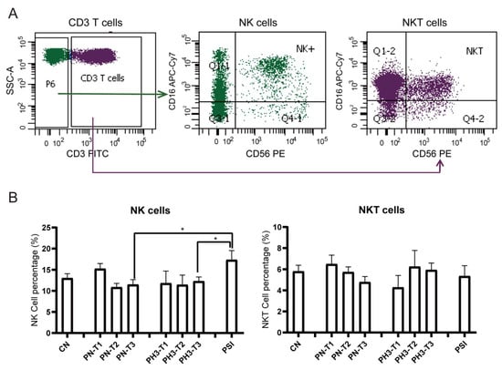 For NK cells (Figure 4), a significant increase in NK cells (CD3−CD16+56+) in the PSI group was observed compared to the PN and PH3 groups. No significant changes were observed in NKT (CD3+CD16+56+) cells across the different groups mostly due to interindividual variability. As an important part of the natural immune system, NK cells are the first line of defense against viral infection, especially influenza virus infection. The rise in NK cells in severe cases of influenza in pregnant women is essentially a manifestation that the body’s natural immune system is strongly activated to fight against the virus under strong viral stimulation. However, in the severe state, this activation often loses control and evolves into hyperactivation and dysfunction.