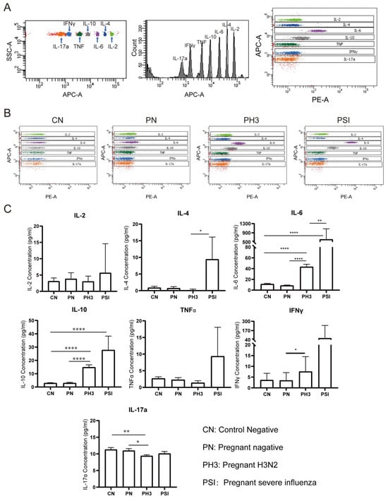 We evaluated serum concentrations of seven cytokines (IL-2, IL-4, IL-6, IL-10, TNFα, IFNγ, and IL-17a) as potential biomarkers for influenza severity in pregnant women (Figure 5). The cytokine analysis was performed without trimester stratification to assess the overall disease-associated patterns.