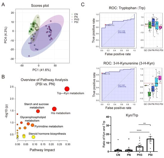 Serum metabolomics revealed Trp–Kyn as indicated potential biomarkers for severe influenza cases in pregnant women. (A) Principal component analysis (PCA) plot of filtered metabolomics data of different groups. (B) Bubble plot of statistically significant metabolic pathways enriched in PSI group vs. PN group. (C) Area under ROC Curve (AUC) of tryptophan (Trp) and 3-hydroxykynurenine (3-H-Kyn) and ratio of Kyn and Trp. **: p < 0.01; ****: p < 0.0001.