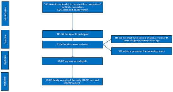 This observational, cross-sectional, and descriptive study involved a cohort of 53,053 workers representing nearly all sectors of employment across various regions of Spain. The sample consisted of 31,753 men (17,527 of whom were shift workers) and 21,300 women (11,281 of whom worked shifts). We included data from workers employed in 74 companies across various sectors (industry, healthcare, security, hospitality, and services) in several autonomous communities in Spain. Participants were selected based on their inclusion in the annual routine medical assessments conducted by the collaborating companies, after applying the inclusion criteria (Figure 1). All data were collected during these routine medical check-ups carried out between January 2019 and June 2020.