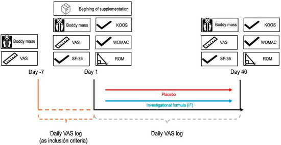 Individuals included in this study met all the inclusion criteria listed below, and did not meet any of the exclusion criteria also listed below: (I) Adults from 18 until 60 years old (II) individuals who engaged in regular physical exercise and met the Word Health Organization (WHO) definition of being moderately active (Engage in moderate-intensity aerobic physical activity for at least 150 to 300 min per week or vigorous-intensity aerobic physical activity for at least 75 to 150 min per week, or an equivalent combination of moderate-intensity and vigorous-intensity activities more than 150 min throughout the week) [24], (III) persistent exercise-associated knee pain lasting at least 2 months prior to study entry, (IV) knee pain score on the visual analogue pain scale of at least 30 mm, taking into account that the scale has a maximum range of 100 mm. Exclusion criteria were: (I) people with severe disease or allergy to any of the product ingredients, (II), subjects with chronic inflammatory diseases affecting the musculoskeletal system, (III) BMI ≥ 30 kg/m2, (IV) treatment with narcotics, steroidal anti-inflammatory drugs or immunosuppressants, (V) symptoms of extreme pain requiring high doses of analgesic therapy for a period longer than 2 weeks or intra-articular injection treatment, (VI) pregnant or lactating women.