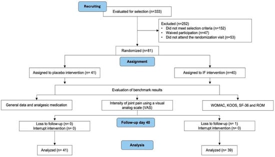 The statistical analysis was conducted using IBM Social Sciences software (SPSS, v.21.0, Chicago, IL, USA). Mean ± SD was used to present the data. The Levene and Shapiro–Wilk tests were employed to check the homogeneity and normality of the data, respectively. A Two-way repeated-measures ANOVA was used to analyze the results of knee ROM and WOMAC, SF-36, and KOOS questionnaires, with factors including time [PRE (day 1) vs. POST (day 40)] and condition (placebo or supplement group). In the case of significance in ANOVA models, Tukey’s post hoc analysis was carried out. Partial eta squared (ηp2) was also calculated as an effect size for time, condition, and time × condition interaction of all variables in the ANOVA analysis. The thresholds for partial eta squared were applied as follows: <0.01, irrelevant; ≥0.01, small; ≥0.059, moderate; ≥0.138, large [33]. The Significance level was set at p ≤ 0.05. Pearson’s correlation (r) was used to evaluate the correlations between the parameters.