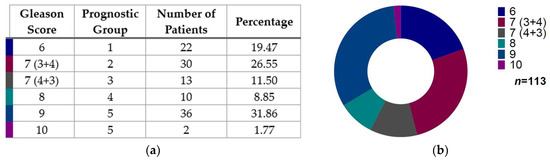 Gleason score distribution in prostate cancer patients: (a) Data distribution of prostate cancer patients indicated according to Gleason score and prognostic group. (b) Chart that shows patients’ distribution according to the Gleason score (n = 113). Note: The total study sample illustrates 116 patients, from which we had data from just 113 patients according to the Gleason score.