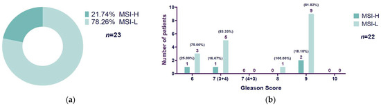 Out of 23 cases of MSI PCa patients, 21.74% (5/23) were microsatellite instability-high (MSI-H), and 78.26% (18/23) were microsatellite instability-low (MSI-L) (Figure 3a). Of the 23 MSI patients, we had Gleason score information for only 22 patients. Patients with Gleason score 6 showed 25% MSI-H (1/4) and 75% MSI-L (3/4), Gleason score 7 (3 + 4) patients exhibited 16.67% (1/6) MSI-H and 83.33% (5/6) MSI-L, Gleason score 8 patients did not show MSI-H but 100% presented MSI-L (1/1), and the most representative Gleason score category, 9, displayed 18.18% (2/11) MSI-H-positive cases and 81.82% (9/11) MSI-L-positive cases. Neither Gleason score 7 (4 + 3) nor Gleason score 10 exhibited MSI-positive cases and, therefore, there were no MSI-H/MSI-L cases to report (Figure 3b).