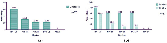 The markers evaluated to determine microsatellite instability were NR-27, NR-21, NR-24, BAT-25, and BAT-26. Of all the evaluated markers, we found a predominant instability in the BAT-26 marker, with 60.87% (14/23) instability among MSI patients. The second unstable marker was NR-21, with 30.43% (7/23) instability. NR-24 and BAT-25 showed the same percentage of instability, 21.74% (5/23). NR-27 did not exhibit instability (Figure 4a). Considering that BAT-26 was the most unstable marker, a comparison was made with the instability frequency observed in the other markers. Statistically significant differences were found between BAT-26 vs. NR-24, NR-25, and NR-27 (p < 0.05), but not between BAT-26 vs. NR-21 (p = 0.1168). Concerning MSI-H and MSI-L, BAT-26 also had a major percentage of instability in both conditions: it exhibited 80% (4/5) MSI-H and 55.56% (10/18) MSI-L. The second marker was NR-21, with 60% (3/5) instability for MSI-H and 22.22% (4/18) for MSI-L. NR-24 and BAT-25 showed the same results, with 60% (3/5) instability for MSI-H and 11.11% (2/18) for MSI-L. Because NR-27 did not present instability, there are no results to report concerning MSI-H or MSI-L (Figure 4b).