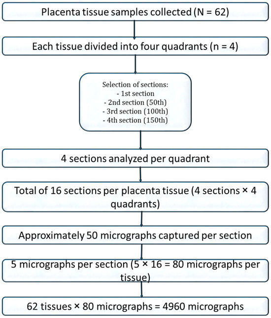 For stereological analysis, images from 16 sections per placenta were compiled. A systematic random sampling approach was used: after a random starting point, every third photomicrograph was selected from the sequence, generating 80 images per placenta and a total of 4960 photomicrographs for quantitative analysis (Figure 1).