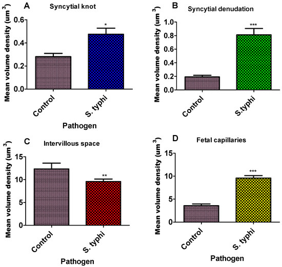 Bar graph of the mean volume density of placenta parameters for Salmonella Typhi. Each column represents the mean ± S.E.M. Unpaired T-test with * p ≤ 0.05, ** p ≤ 0.01, and *** p ≤ 0.001 compared to their matched pairs. (A)—syncytial knot, (B)—syncytial denudation, (C)—intervillous space, and (D)—foetal capillaries for Salmonella Typhi.