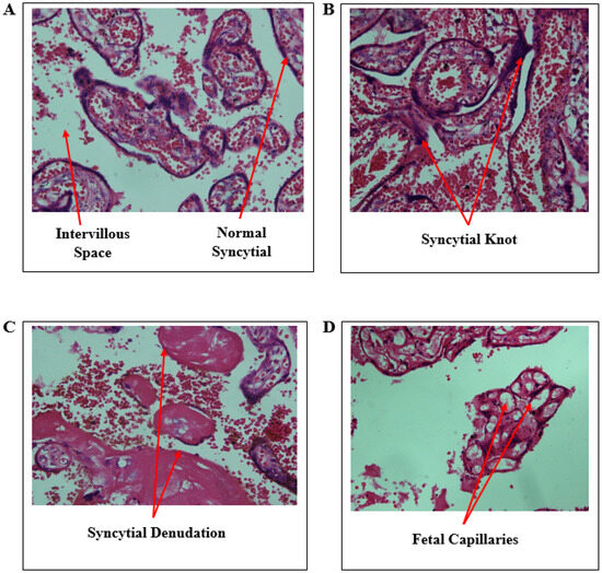 Micrographs of Salmonella Typhi-exposed and unexposed placentae. (A)—control with normal syncytial, (B)—syncytial knot, (C)—syncytial denudation, and (D)—foetal capillaries and intervillous space.